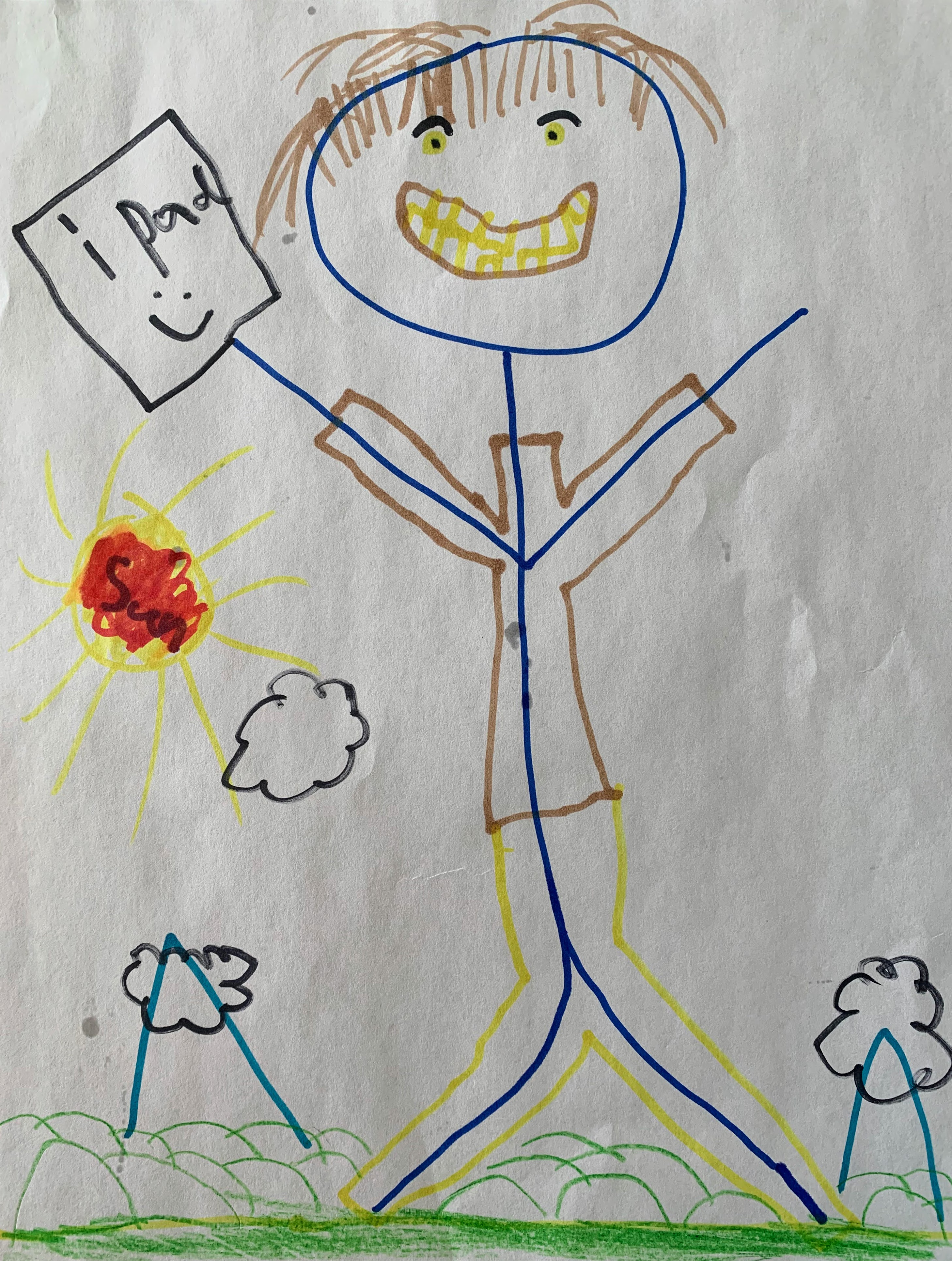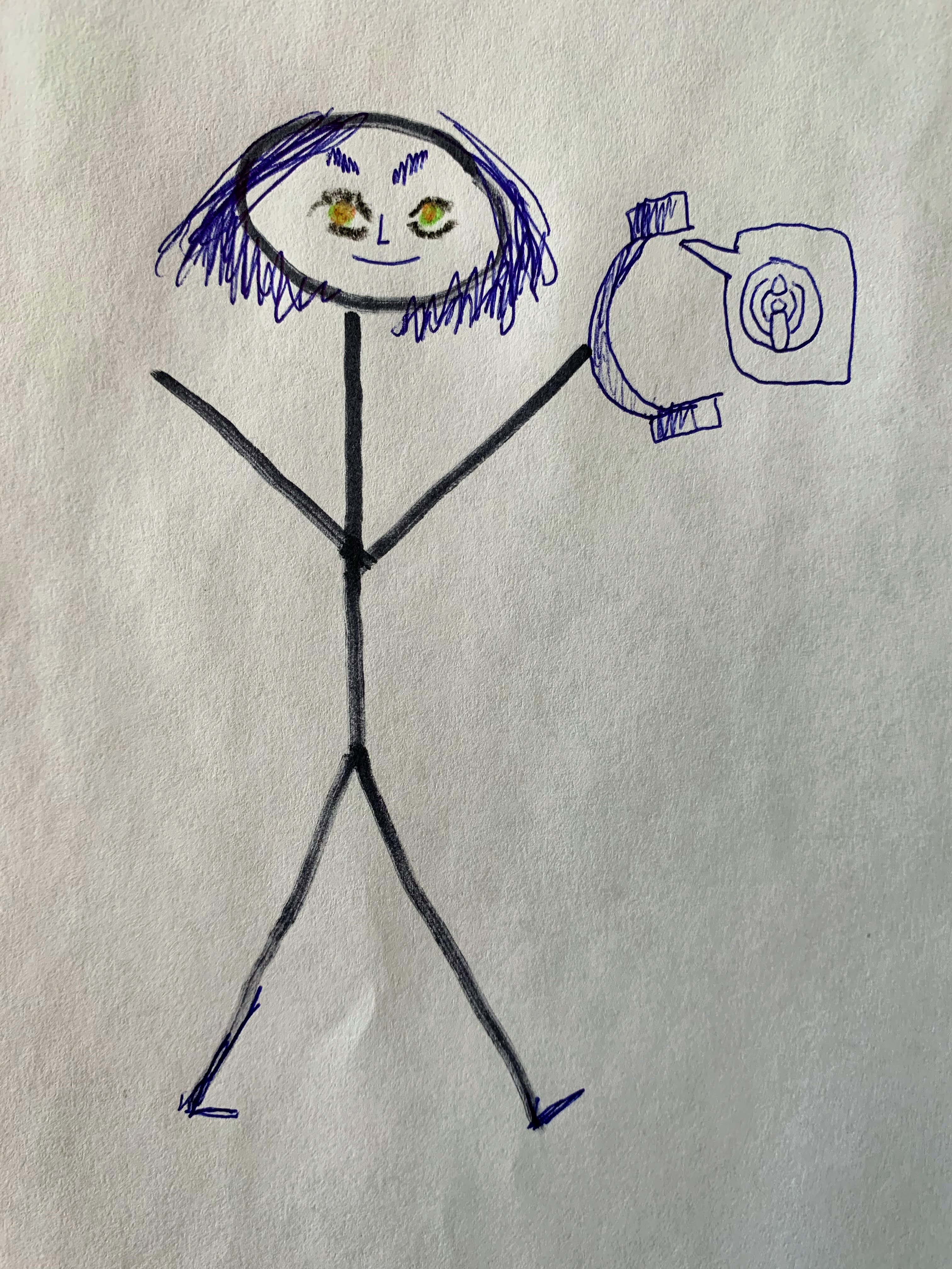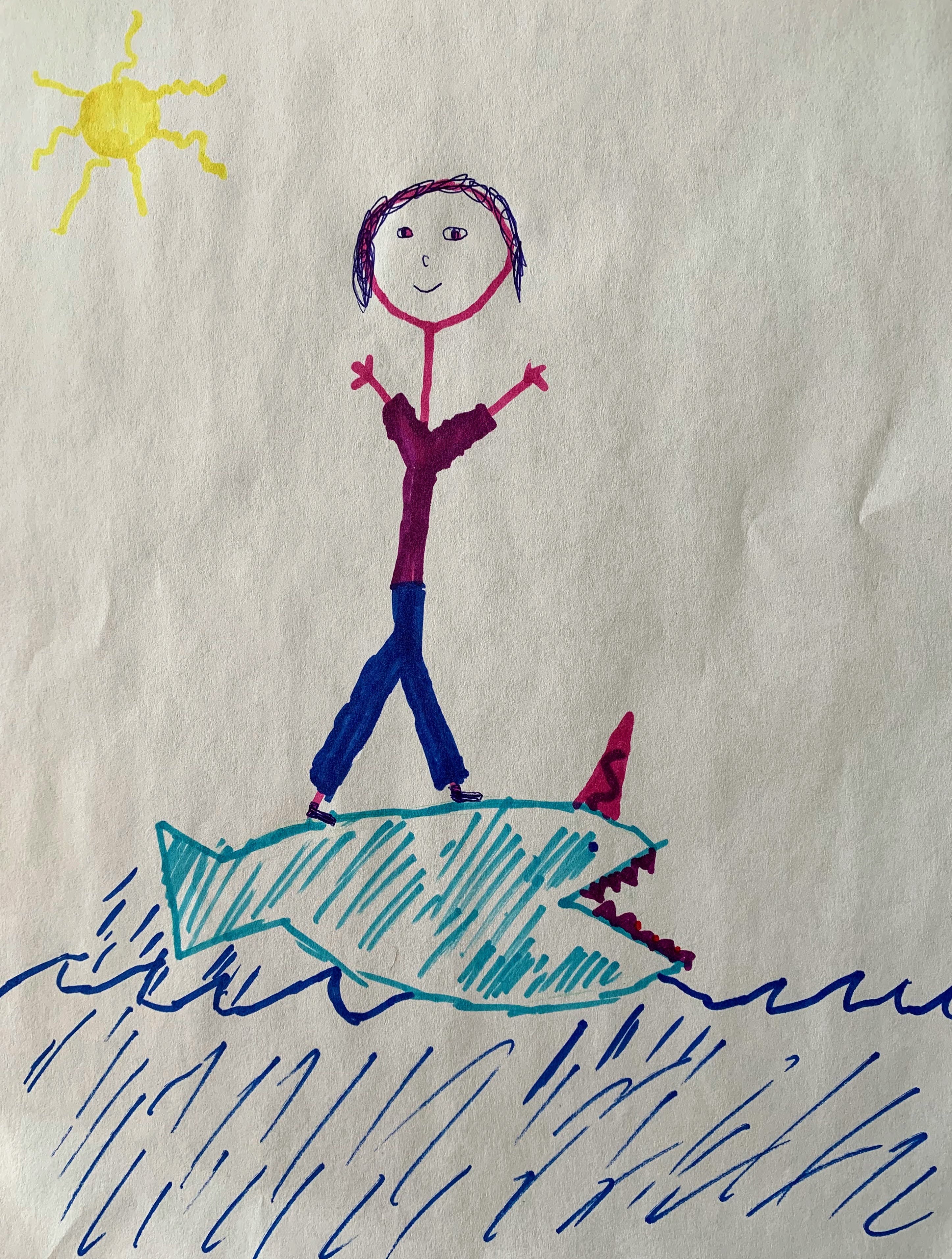 The Crimson Hen Crew! Stick figure self-portraits. You guess who is who. And yes, that’s a unicorn-shark.